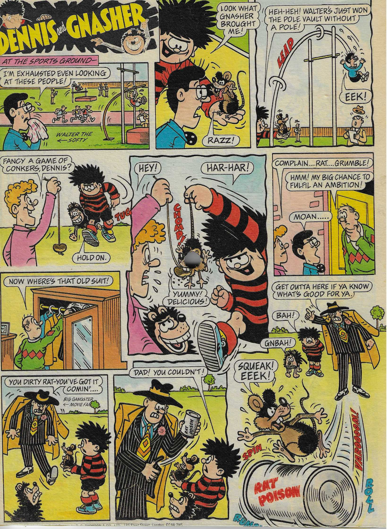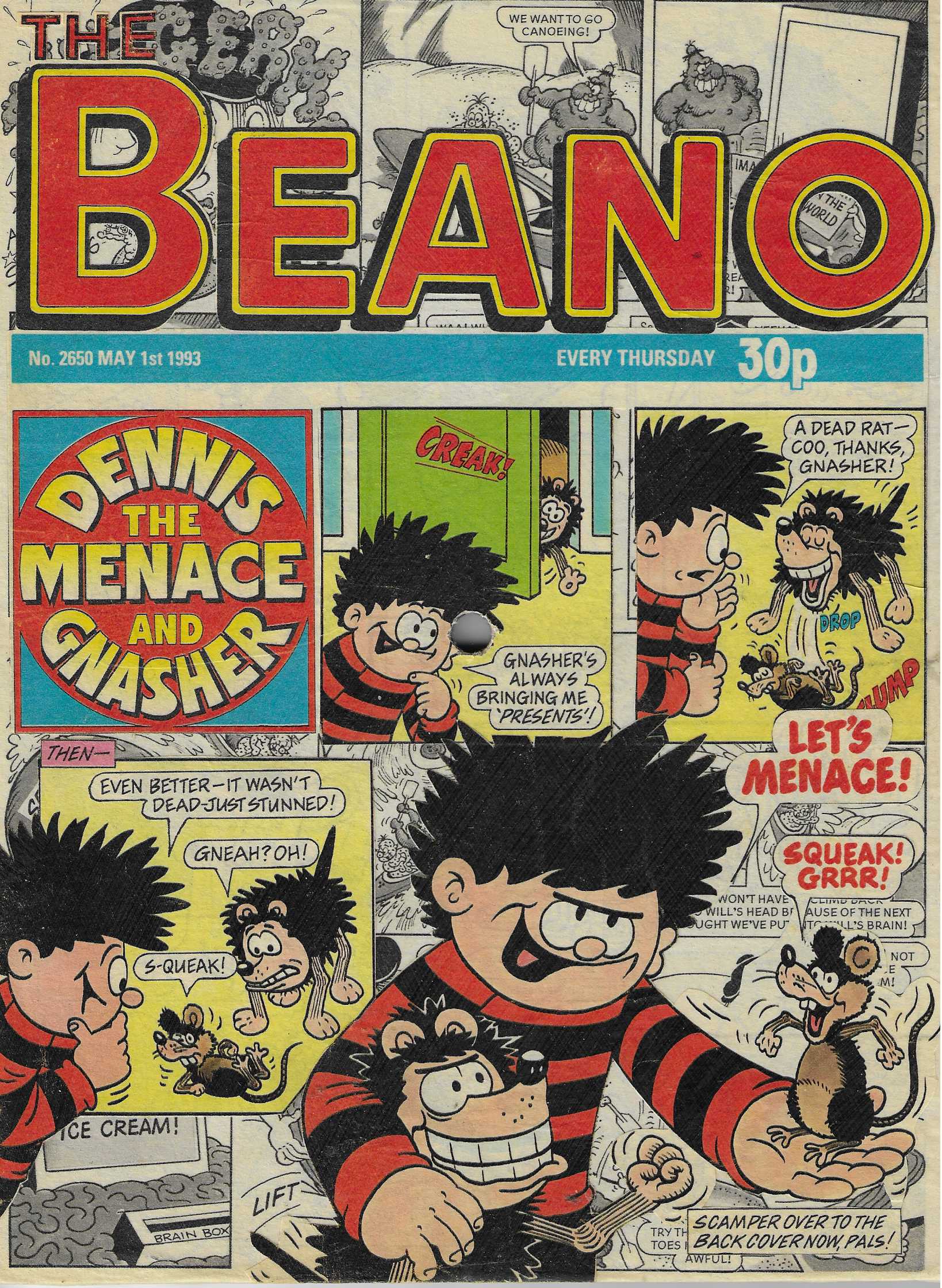 The Beano Cover featuring Dennis The Menace and Gnasher from May 1st, 1993 - This one features a cut through where all the dead space on the cover has been removed to reveal the original second page of the issue. The back features the original back page and continues the riveting story.