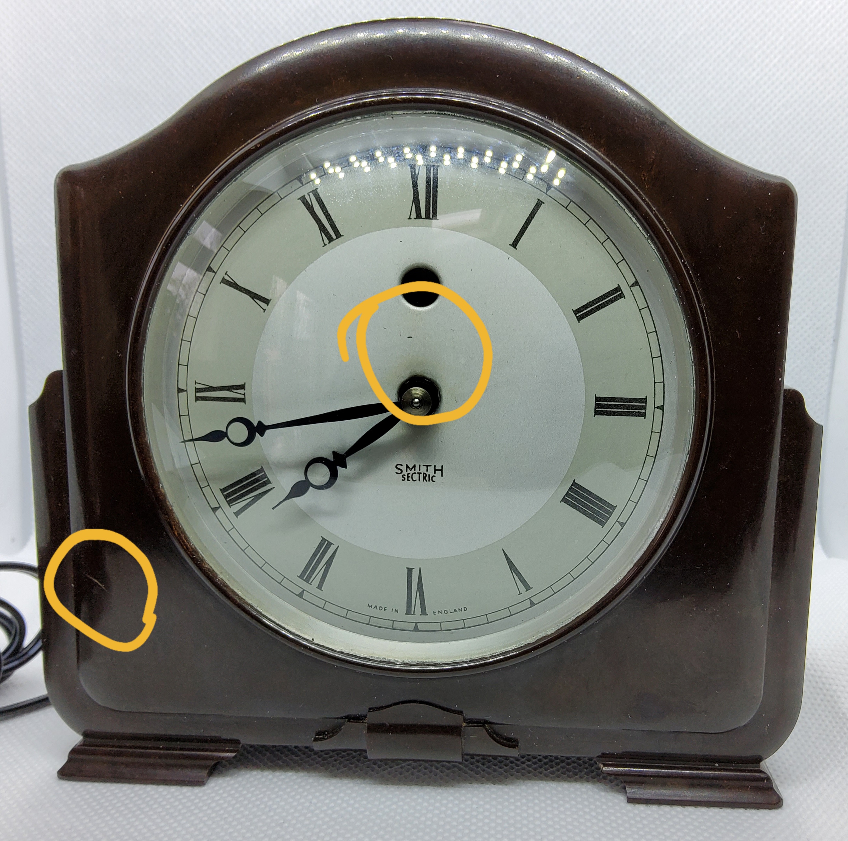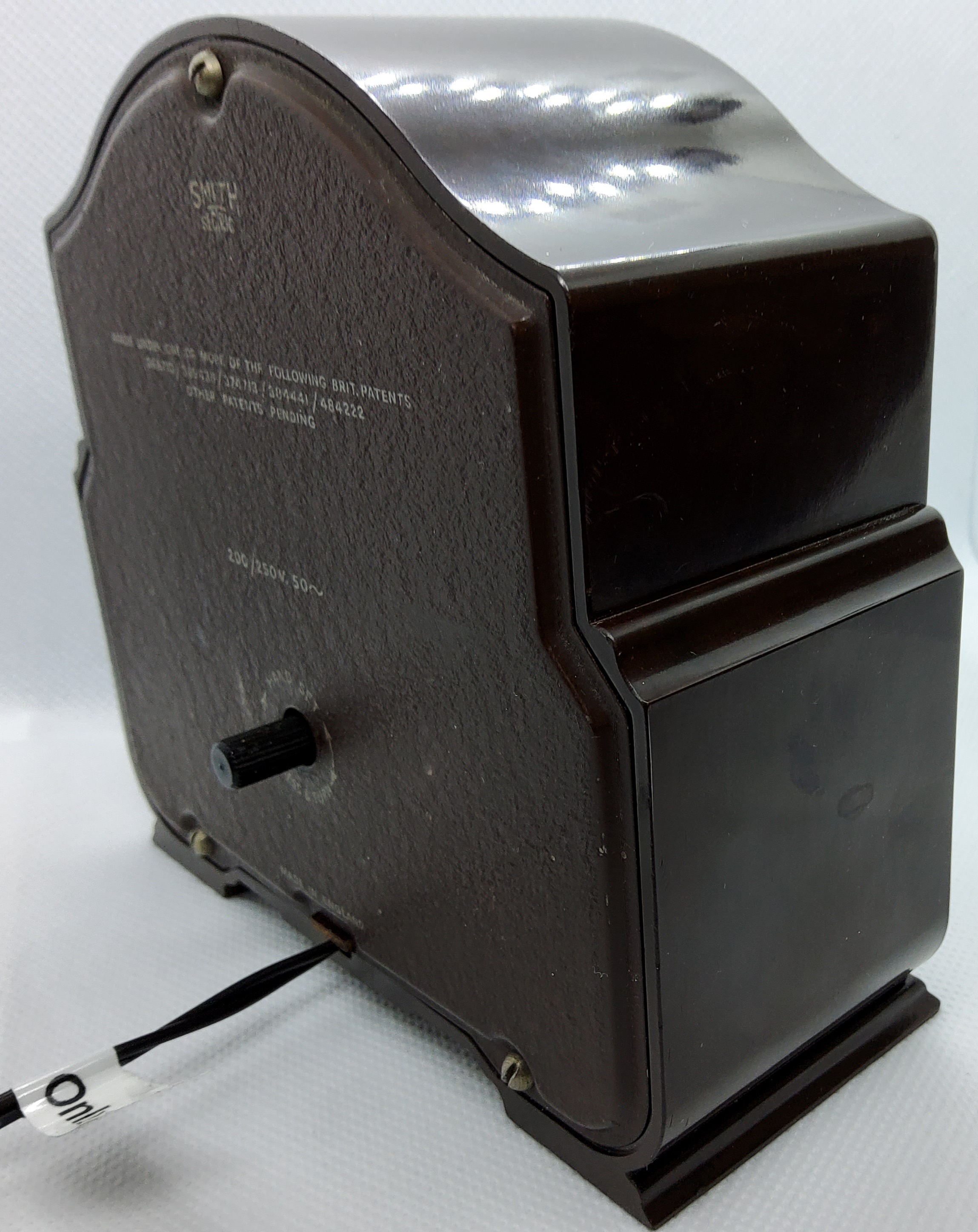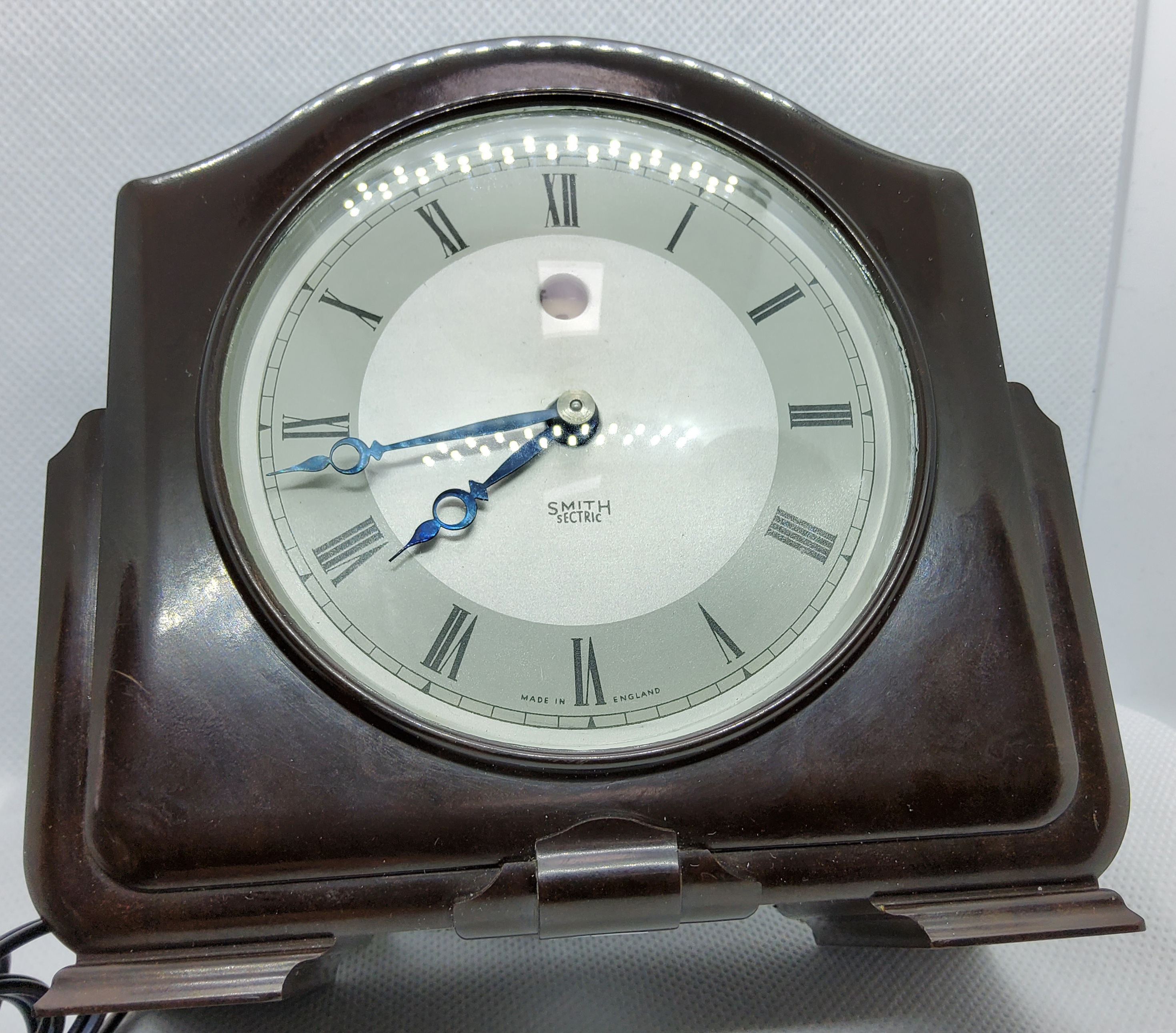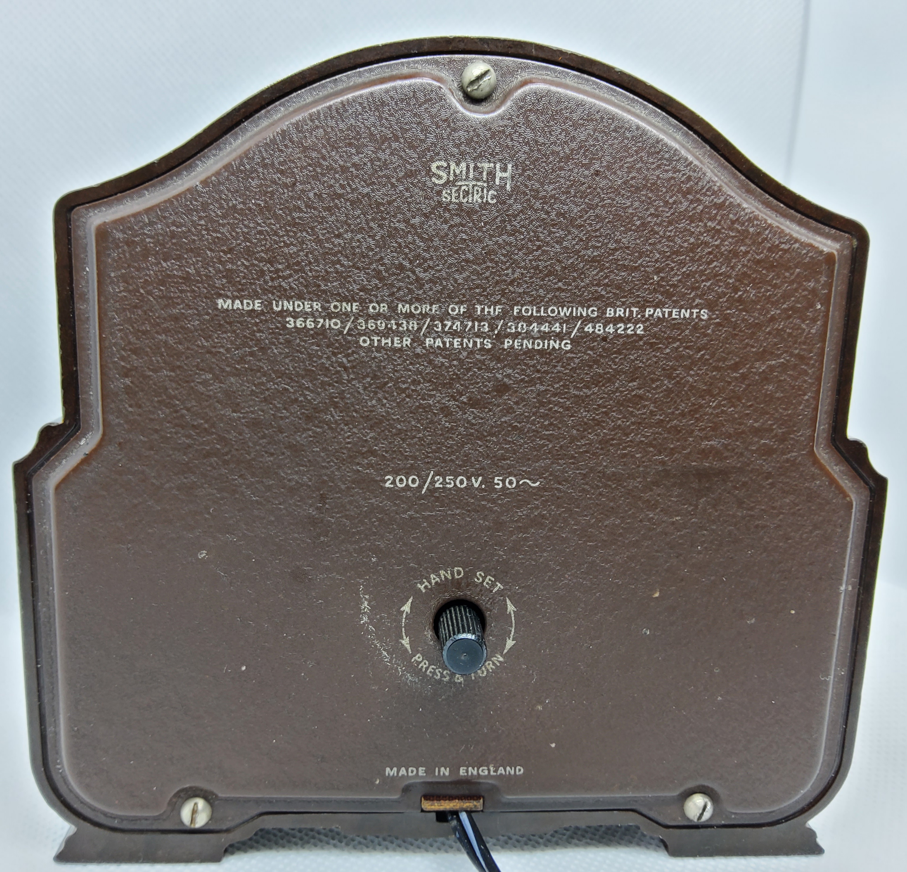 This is a Smiths Electric Clock that is in great condition, it has marks on the back where the time has been set, a scratch on the left front and a scratch on the glass but other than that it's in great shape. Not totally original as it has been converted, and comes with, a hard wired 18VAC plug transformer because the original wiring was unsafe and the coil insulation was failing.